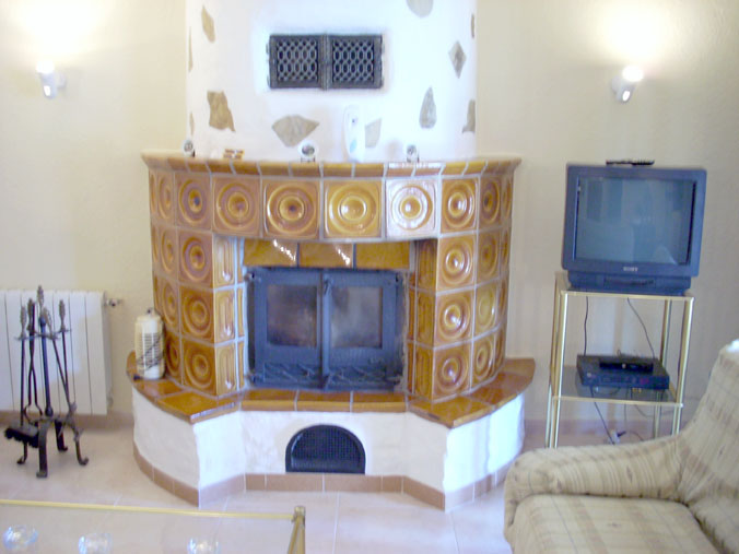 Esszimmer mit SAT-TV und Kamin, Küche mit Spülmaschine und Mikrowelle,