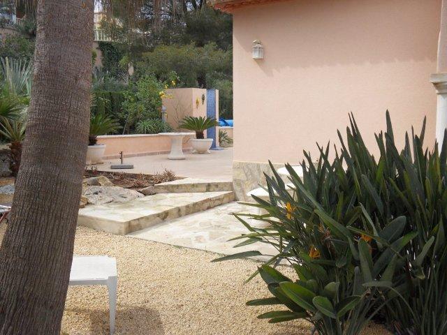 rund um das Haus ist pflegeleicht angelegt und besteht aus Palmen, Büschen,
