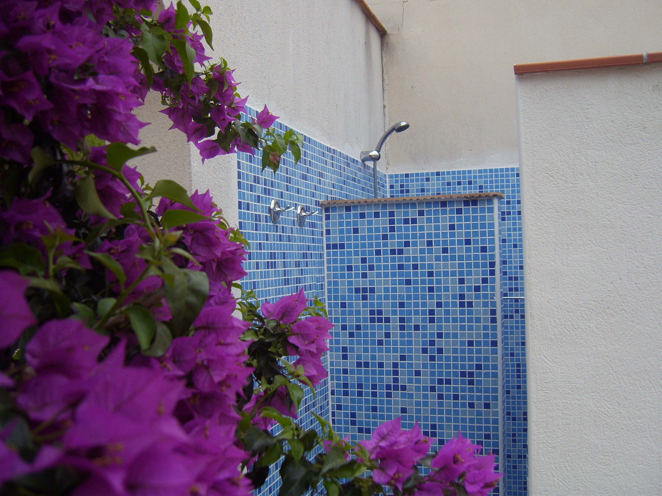 It consists of two parts, connected by a patio with shaded roof, pool, outdoor shower and balustrade and is